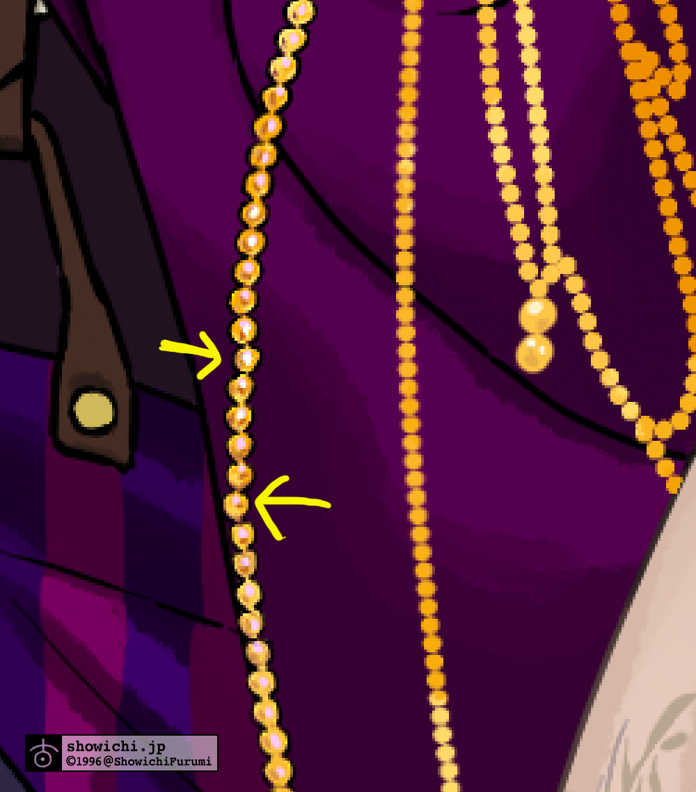 この部分はアーチ状になっているビーズ紐が手前に向かって伸びているはずなので、ブラシで描いた部分を手描きで調整して奥行きを出しています。「ブラシの生っぽさ」も消えます。